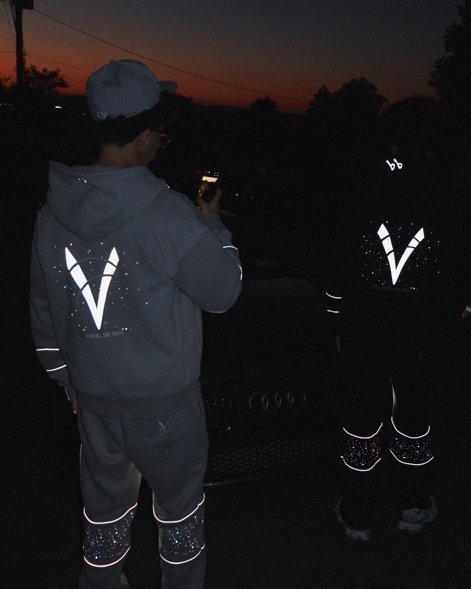 Bold front embroidery + reflective back print